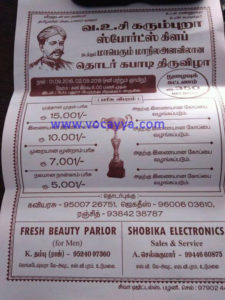 வஉசி கரும்புறா விளையாட்டு மன்றம் நடத்தும் மாநில அளவிலான தொடர் கபாடி திருவிழாவை காண வரும் கபாடி ரசிகர்களையும் விளையாட்டு வீரர்களையும் வஉசி கரும்புறா விளையாட்டு மன்றம் சார்பாக அனைவரையும் அன்புடன் வரவேற்கிறோம்