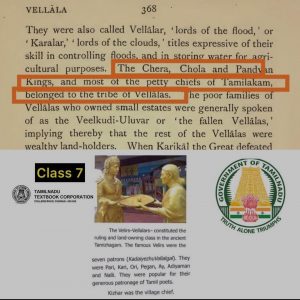அதற்கு கீழ் உள்ள தமிழக அரசின் பாட நூல் கழகம் வெளியிட்ட ஏழாம் வகுப்பு பாட நூலில் கடையெழு வள்ளல்களான வேளிர்களான பாரி, ஓரி, காரி, பேகன், ஆய், அதியமான், நல்லி ஆகியோர் வேளாளர் இனத்தை சார்ந்தவர்கள் என குறிப்பிடப்பட்டுள்ளது,