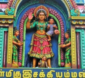 1.“இவள் முற்பிறப்பில் நவஞ்ஜயென்னும் பார்ப்பனி. தன் கணவனையும் குமாரனையும் ஒருவன் கொலை செய்ததால் பழிக்குப்பழி வாங்க திருவாலங்காட்டில் புரிசைக்கிழாருக்குப் புத்திரியாகப் பிறந்து அவன் பேயென்று நீக்க அலைந்து திரிந்து தரிசன செட்டியாகப் பிறந்திருக்கும் தன் கணவனைக் கண்டு களித்து அவனைப் பலவாறு மயக்கி பழையனூர் வெள்ளாளரிடம் முறையிட்டு அவர்கள் 70 பேரையும் அவன் உயிர்க்கு பிணையாக இருக்க உடன்படுத்தினள். அவர்கள் அவ்வாறு பிணை இருப்பதாக செட்டிக்குக் கூறி அவளுடன் இருக்கும்படி உடன்படுத்தினர். இவள் அவனிடம் இருந்த மந்திர வாளை நீங்கச் செய்து அவனுடனிருந்து அவனைக் கொலைபுரிந்து மீண்டும் செட்டியின் தாய் போல வந்து வேளாளர் 69 பேரையும் தீயில் முழுகச் செய்வித்து மிகுந்த ஒருவன் போயிருந்த கழனியிடம் அவன் மகள் போலச் சென்று நடந்த செய்தி கூறிப் பழி வாங்கினள். வேல மரத்தில் இருந்த அண்ணன் இறந்ததற்கு ஊரார் வெட்டிய வேல மரம் காரணமாதலால் ஊரார் எழுபது பெயரையும் பழிவாங்கினள்.”